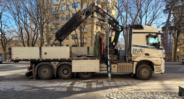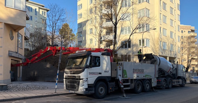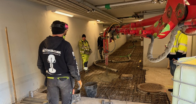 Betong transporterades med betongbil och pumpades via kranbil in genom en rörarm till gjutytan.
