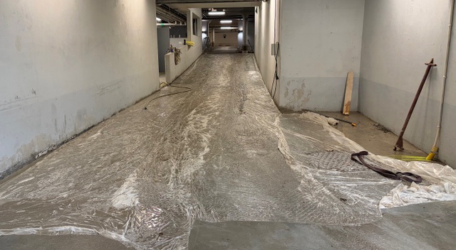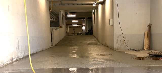 Ytan täcktes sedan med plast och har vattnats i en vecka för att betongen ska härda långsamt. Detta är orsaken till att vatten har sipprat ut från garaget under den senaste tiden.