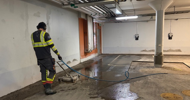 All befintlig asfalt har under några dagar tvättats med 95-gradigt högtrycksvatten och roterande borstar.