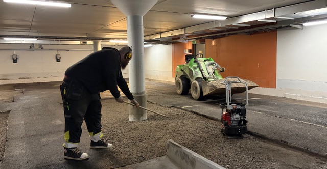 Ytterligare utjämning av ytor har utförts inför kommande asfaltering, och mer grus har lagts ut för att justera fall och nivåer.